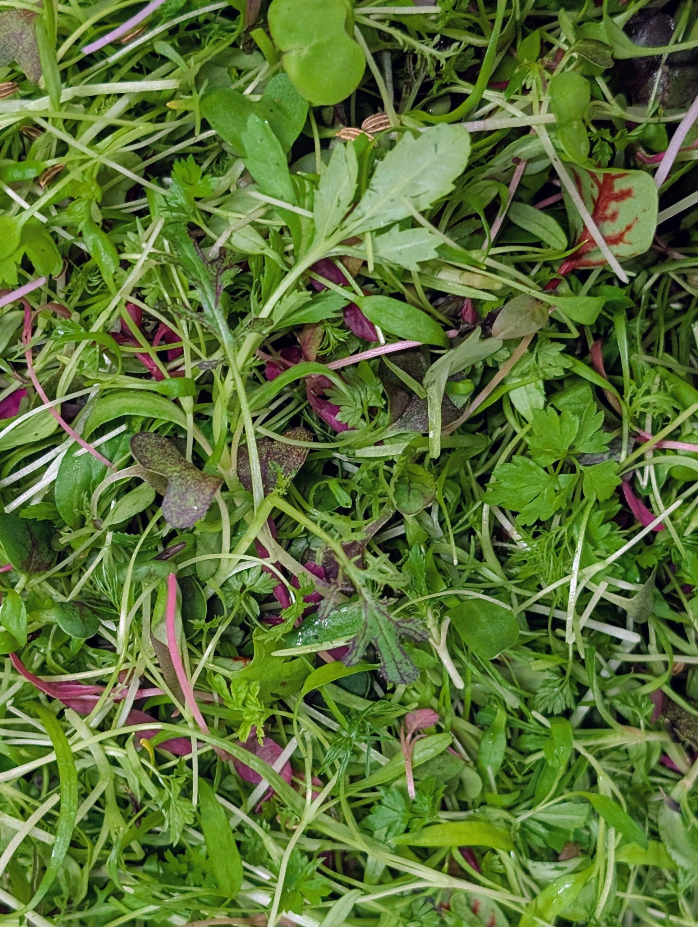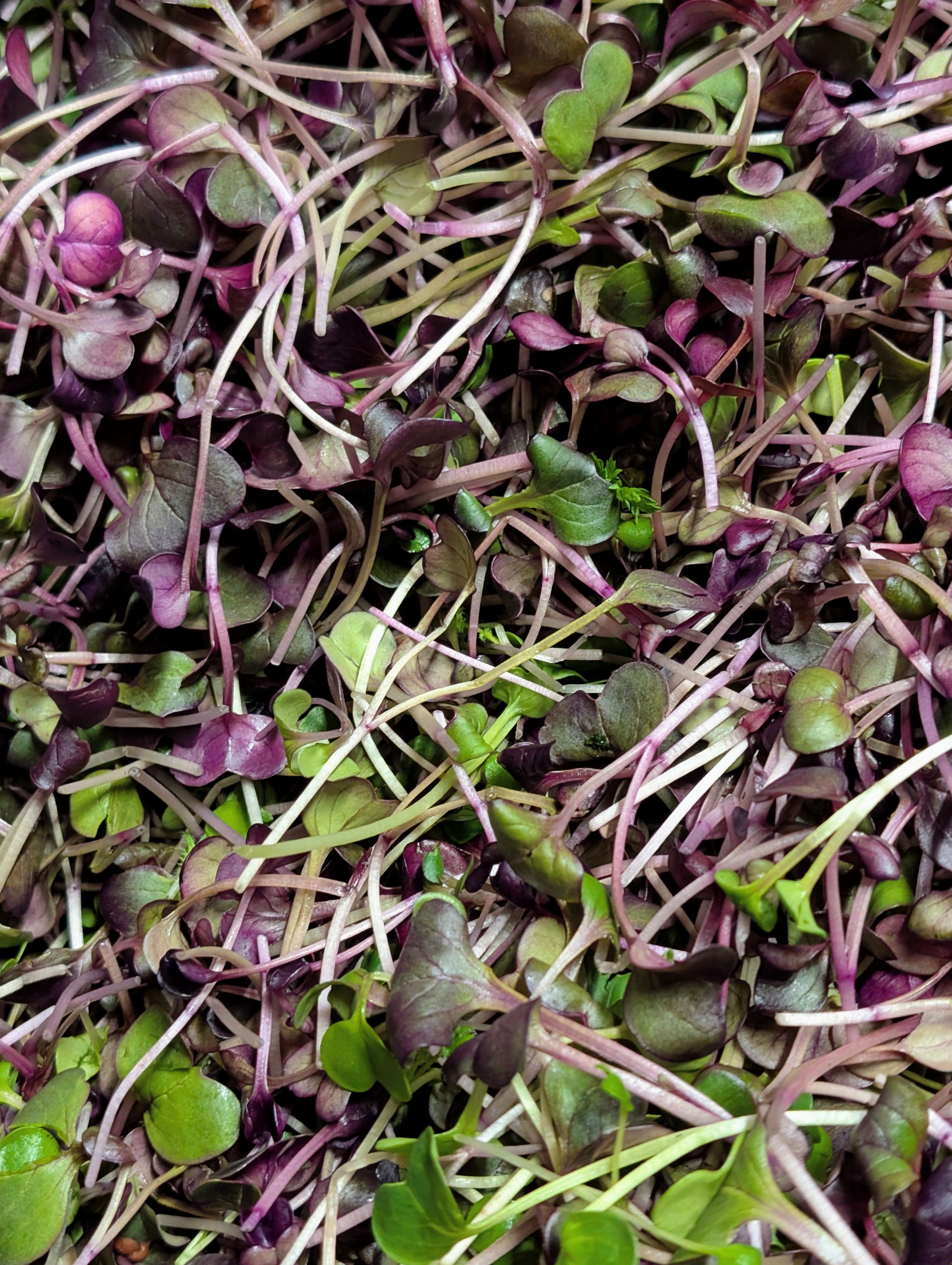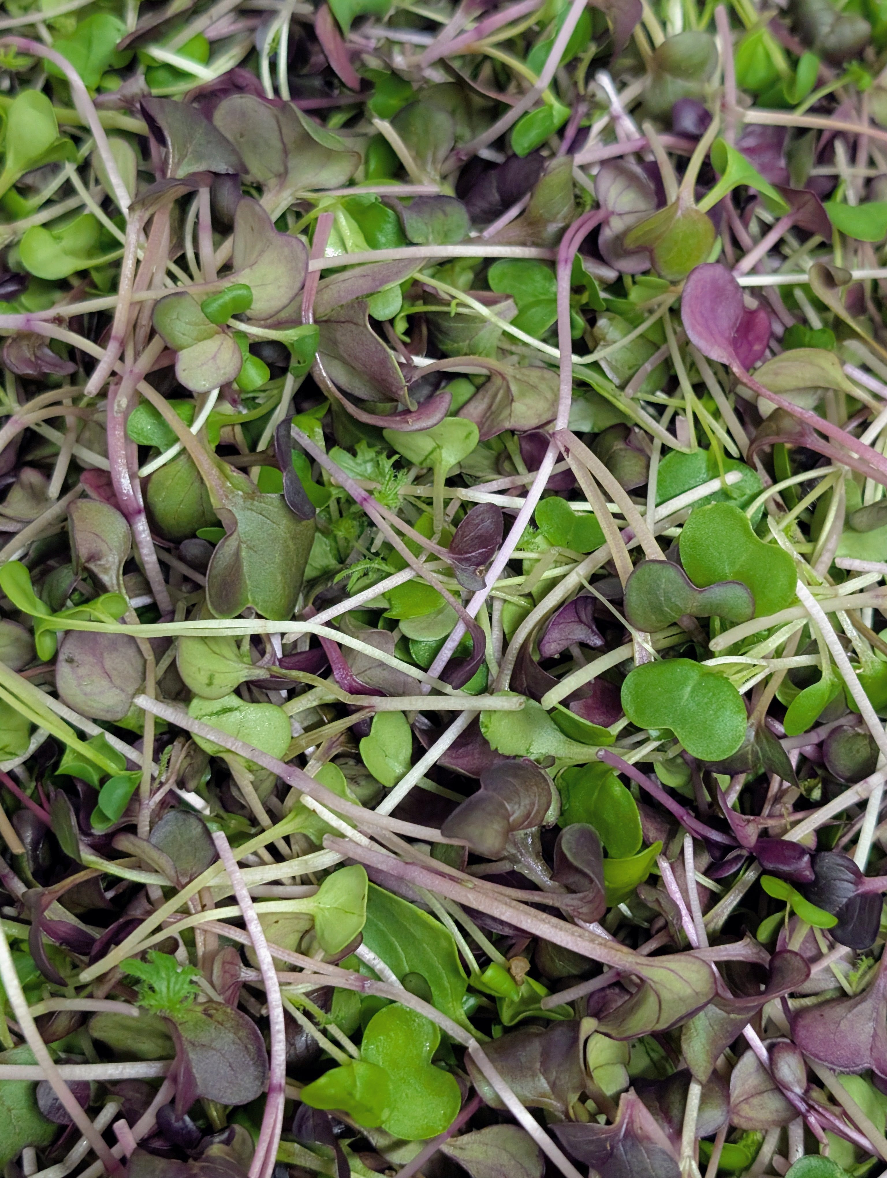 a flavorful and diverse blend of cruciferous microgreens: radish, broccoli, cabbage, kale
